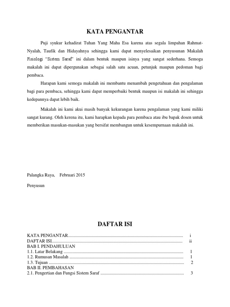 Doc Makalah Sistem Saraf Fian Ritiauw Academia Edu from 0.academia-photos.com Nahdatulrugaiya program studi s1 keperawatan stikes bina generasi polewali mandar tahun ajaran 2017/2018 1 kata pengantar puji syukur kehadirat tuhan yang maha esa,atas berkat dan rahmatnya sehingga saya dapat menyelesaikan makalah sistem saraf otonom. Makalah ini kami susun guna melengkapi tugas mata kuliah ilmu dasar keperawatan ii. Makalah anatomi fisiologi manusia sistem saraf manusia disusun oleh : 3) untuk mengetahui struktur sel saraf. Unit terkecil pelaksanaan kerja sistem saraf adalah sel saraf atau neuron. Latar belakang masalah sistem saraf merupakan sistem koordinasi (pengaturan tubuh) berupa penghantaran impul saraf ke susunan saraf pusat, pemrosesan impul saraf dan perintah untuk memberi tanggapan rangsangan. Cara manusia bertindak dan bereaksi bergantung pada pemrosesan neuron yang rumit, tersusun, dan diskret. Sistem saraf ini berupa 25 pasang ganglion atau simpul saraf yang terdapat di sumsum tulang belakang.